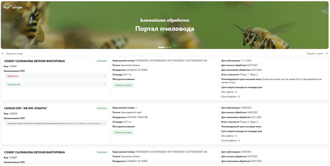 Сам «Портал Пчеловода» внесен в реестр средств массовой информации. На «Портале Пчеловода» размещается информация о планируемых применениях пестицидов и агрохимикатов (далее – ПАТ) на основании реестра планов применения ПАТ ФГИС «Сатурн».