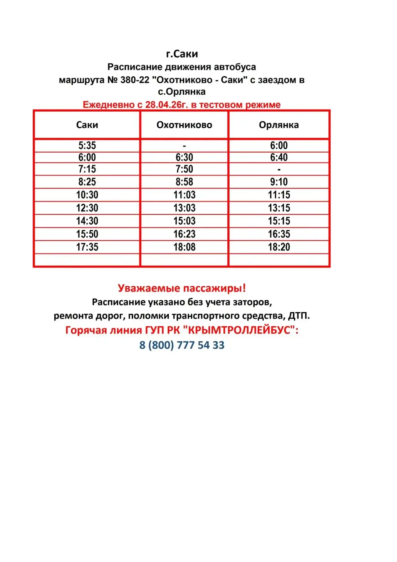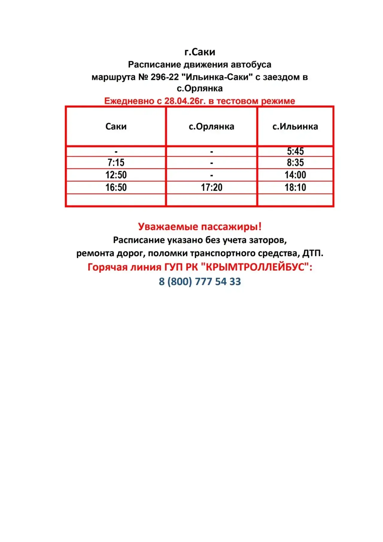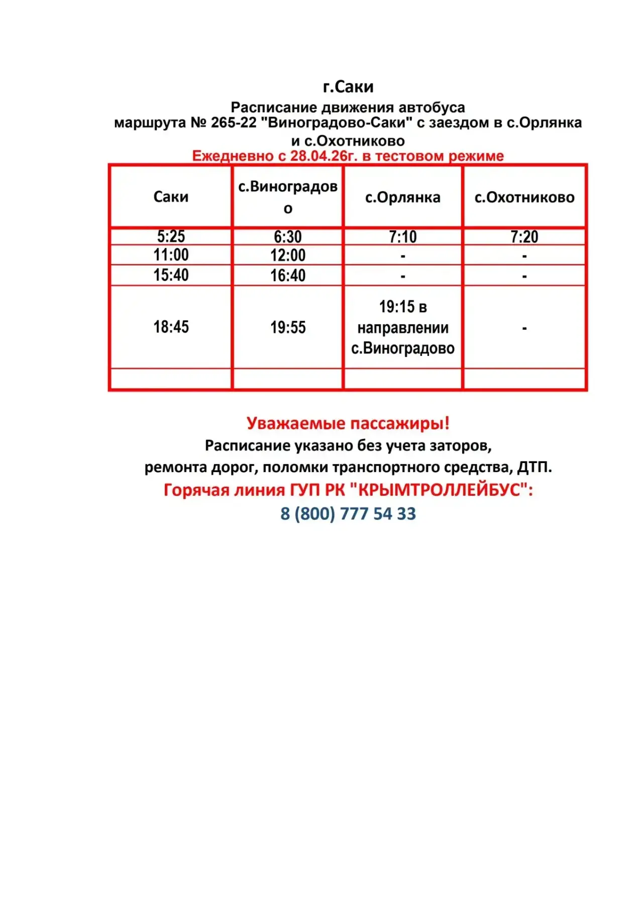 Просим обратить ваше внимание, что с 28 апреля вступают в силу новые расписания движения по следующим маршрутам Сакского района Республики Крым: