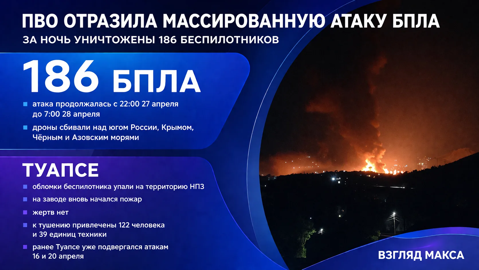 Минувшей ночью силы ПВО отразили массированную атаку украинских беспилотников по югу России, Крыму и акваториям Чёрного и Азовского морей. По данным Минобороны РФ, с 22:00 мск 27 апреля до 7:00 мск 28 апреля были перехвачены и уничтожены 186 БПЛА самолётного типа.