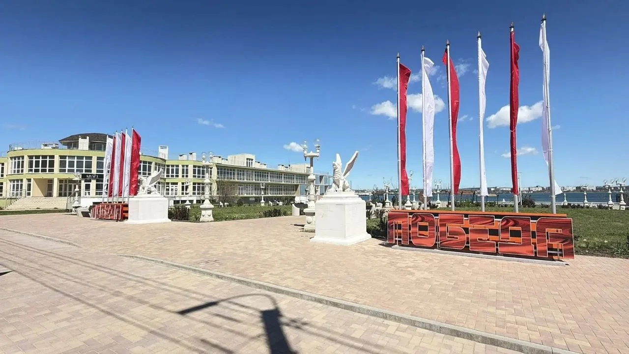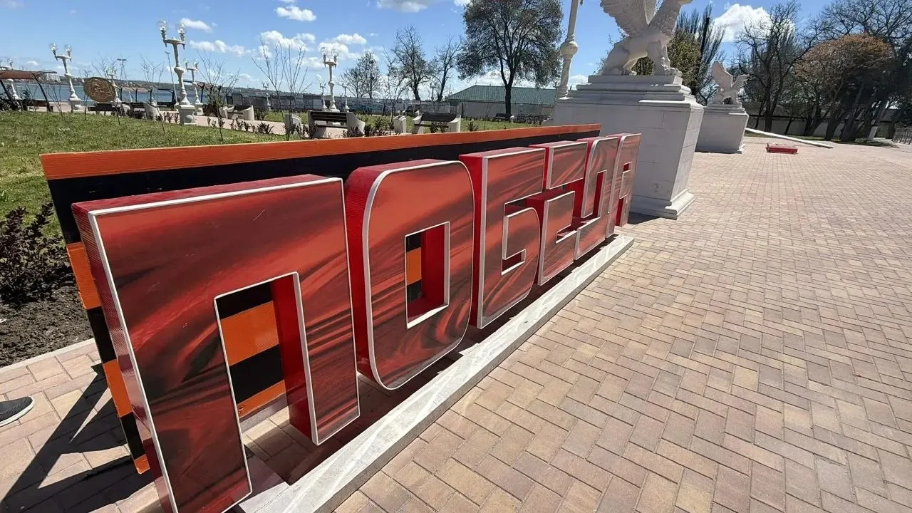 Праздничная инсталляция в виде слов «Победа» на фоне Георгиевской ленты и красно-белых флагов установили в сквере «Монетка» на Адмиралтейском проезде.