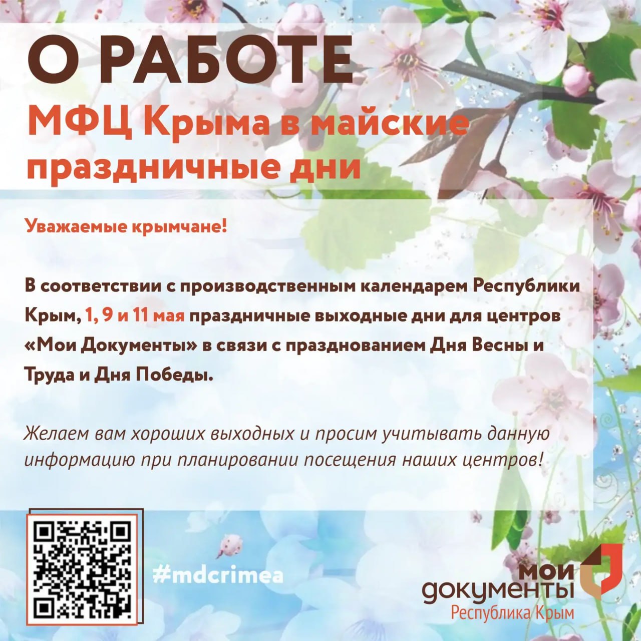 По информации пресс-службы «МФЦ», 1, 9 и 11 мая — выходные дни для центров «Мои Документы» в связи с празднованием Дня Весны и Труда и Дня Победы.