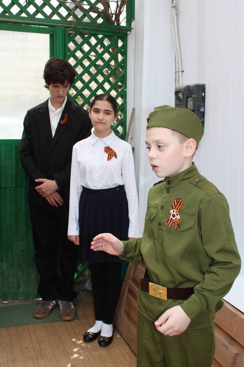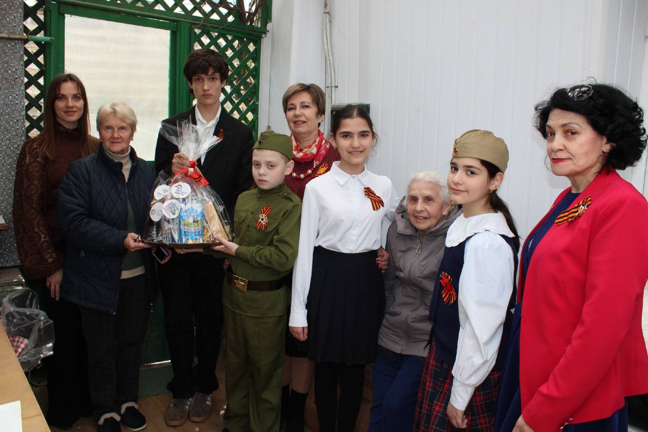 Дети и взрослые поздравили ветерана с наступающим Днём Победы и приближающимся юбилеем, прочли прекрасные стихотворения, пожелали ей доброго здравия, поблагодарили за многолетний труд и вручили символ акции - корзину с подарками от многонационального народа России.