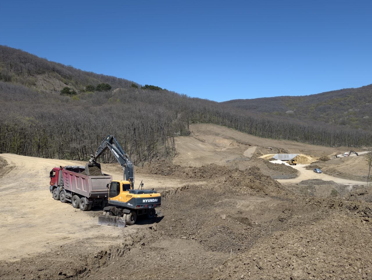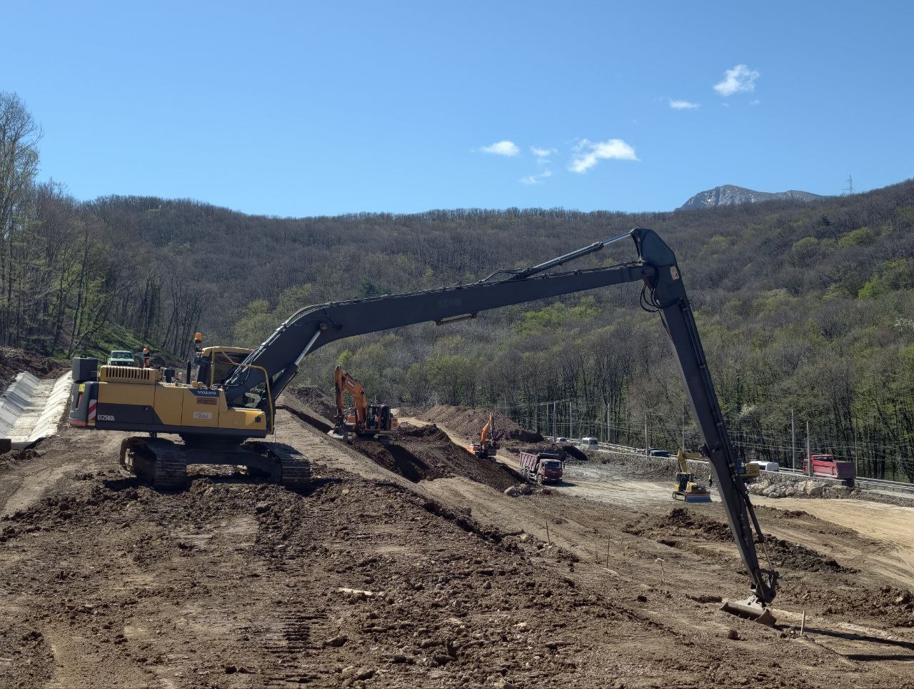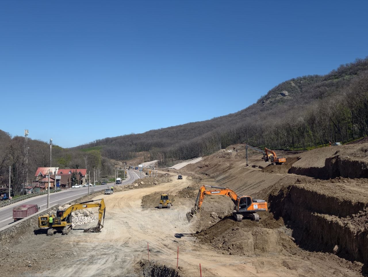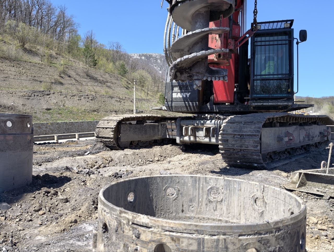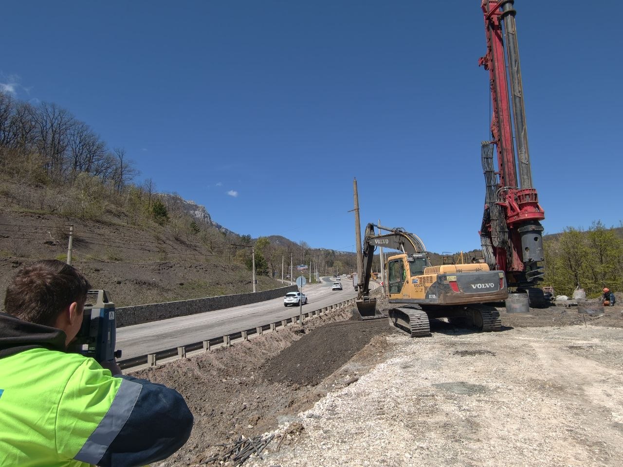 На участке реконструкции автомобильной дороги Перевальное - Алушта продолжаются работы по устройству выемки, буронабивных свай, подпорных стен и противооползневых сооружений.