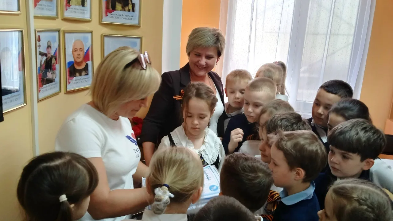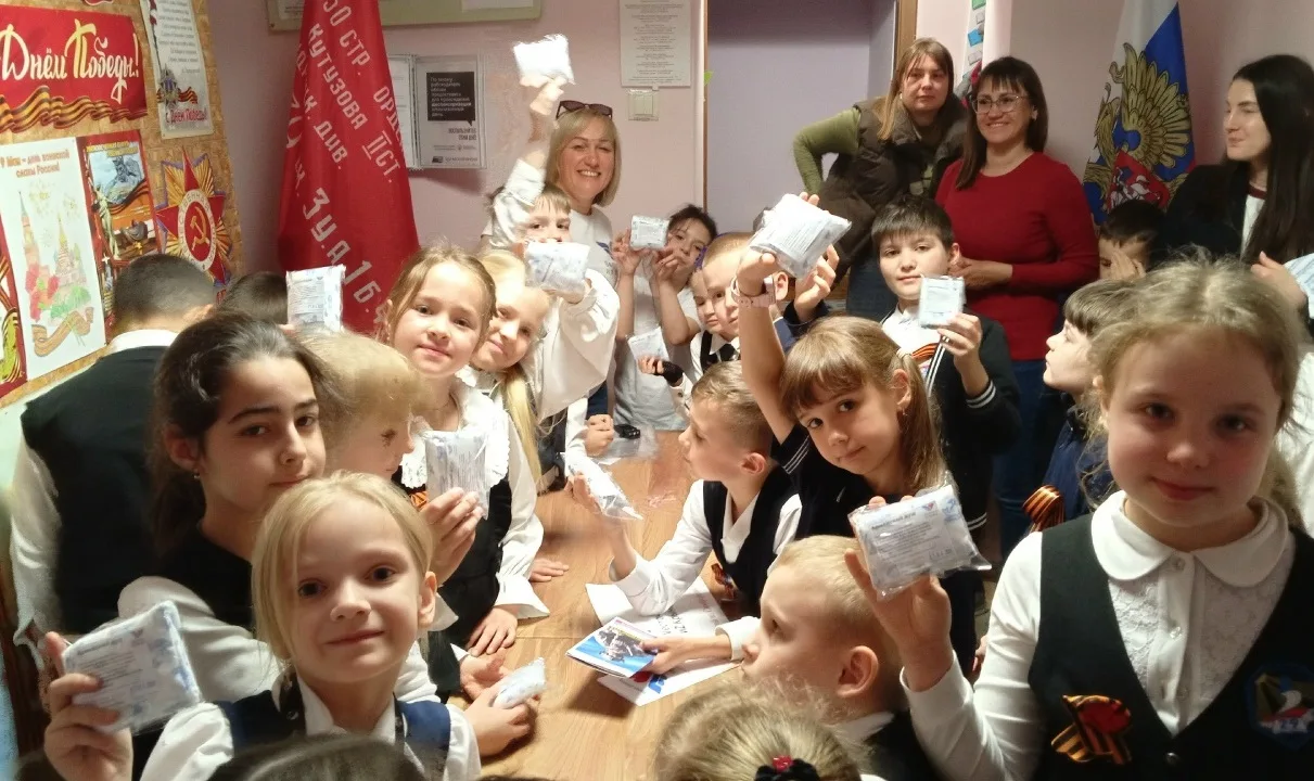В завершение встречи дети посмотрели видеосюжеты о волонтёрах из России и Крыма. Первоклассники передали участникам СВО окопные свечи и письма, что стало символом их поддержки.