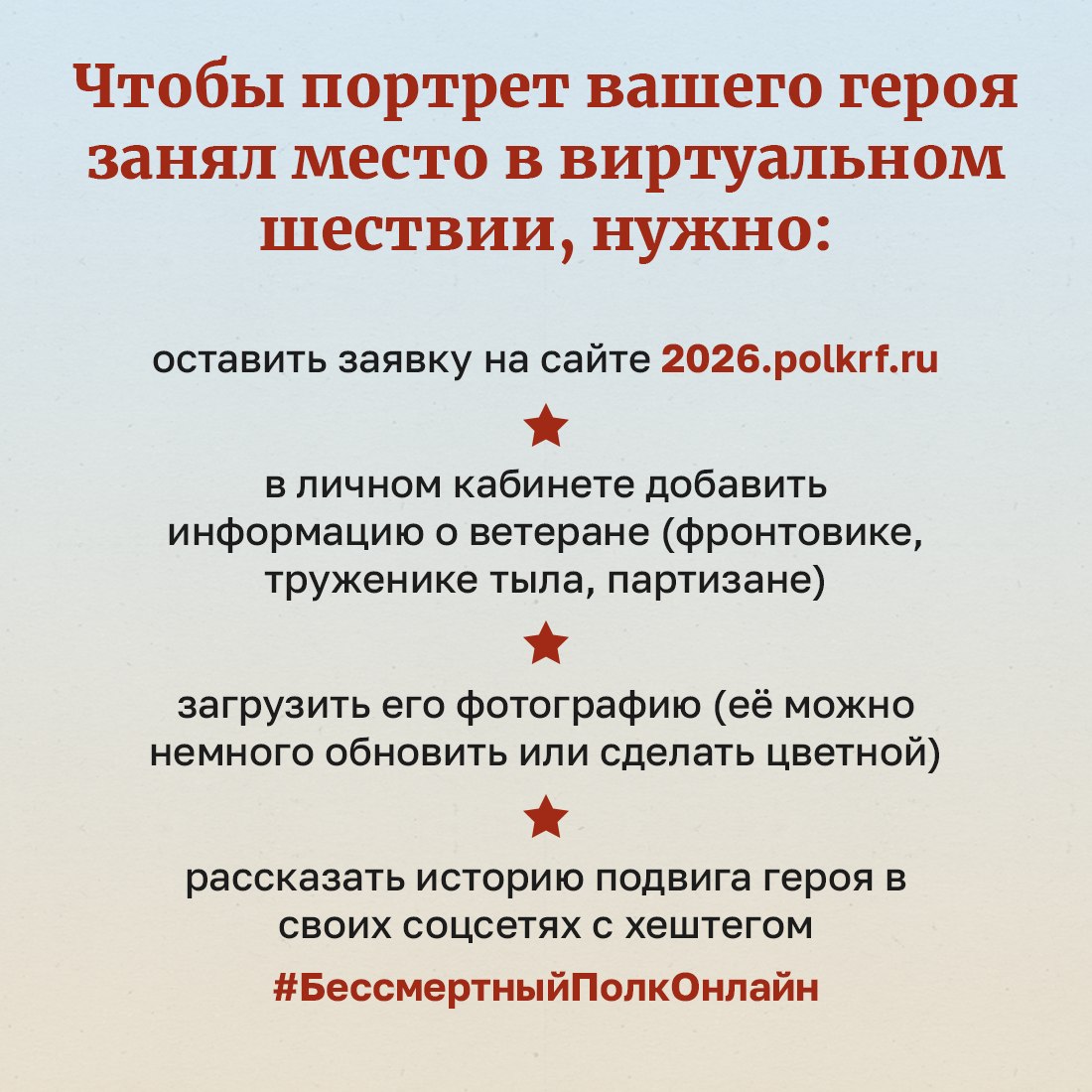 Сделать это можно до 6 мая включительно на сайте 2026.polkrf.ru, в мини-приложениях ВКонтакте https://vk.com/polk_app, Одноклассники https://ok.ru/app/polk или МАКС https://max.ru/polk_app_bot. В личном кабинете останется загрузить фото и данные о ветеране.