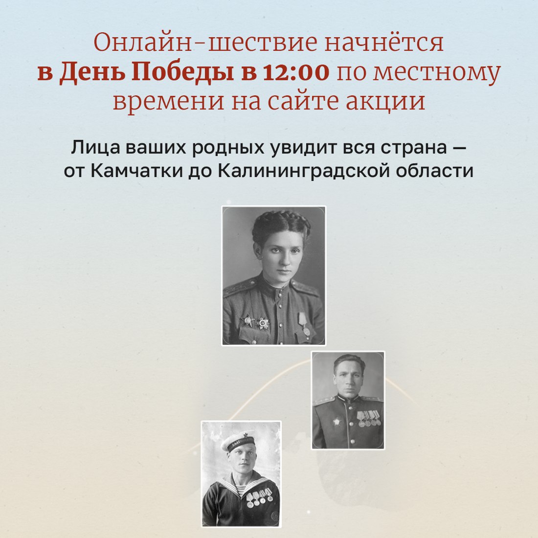 Цифровое шествие героев Великой Отечественной войны начнётся 9 мая в 12:00 по местному времени на сайте 2026.polkrf.ru и экранах всей страны. Первыми его увидят жители Чукотки и Дальнего Востока, а завершится оно на западных рубежах страны — в Калининградской области.