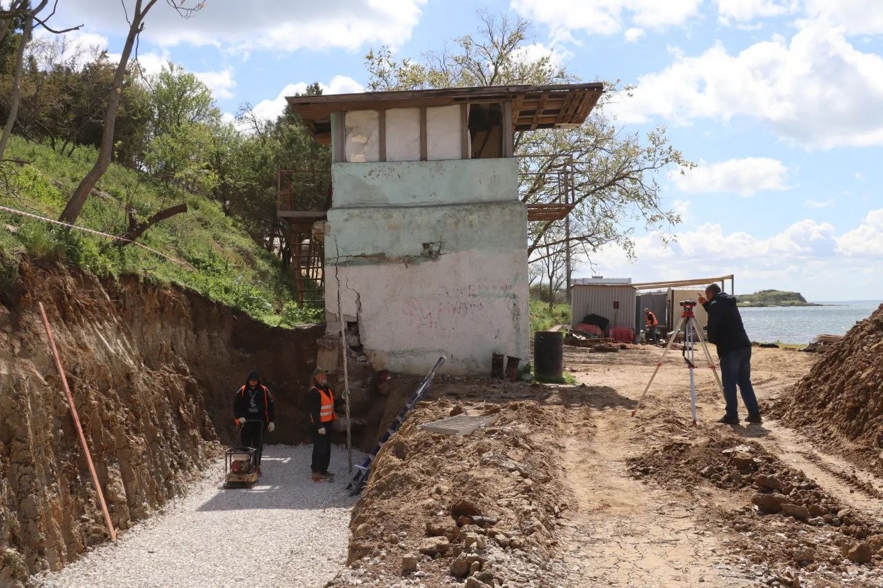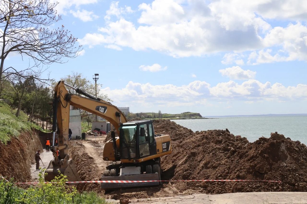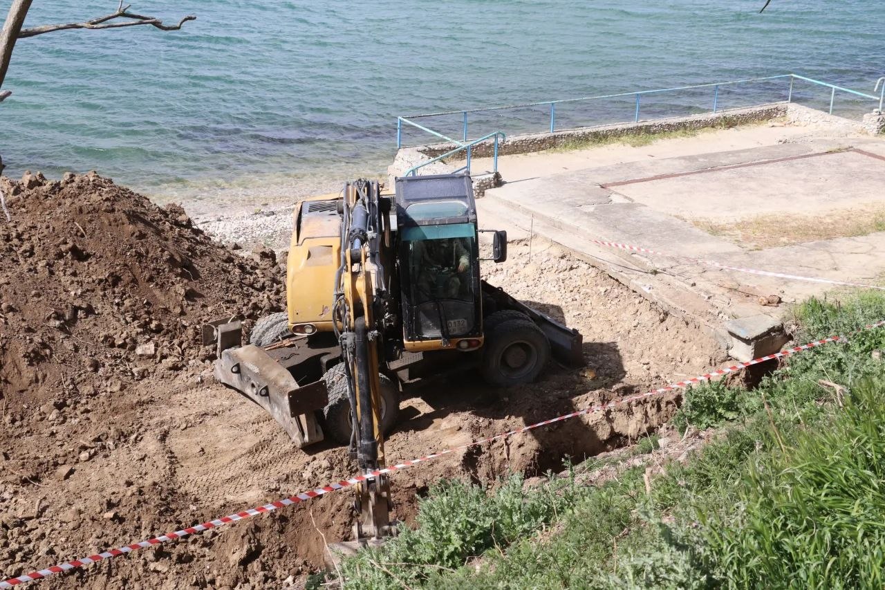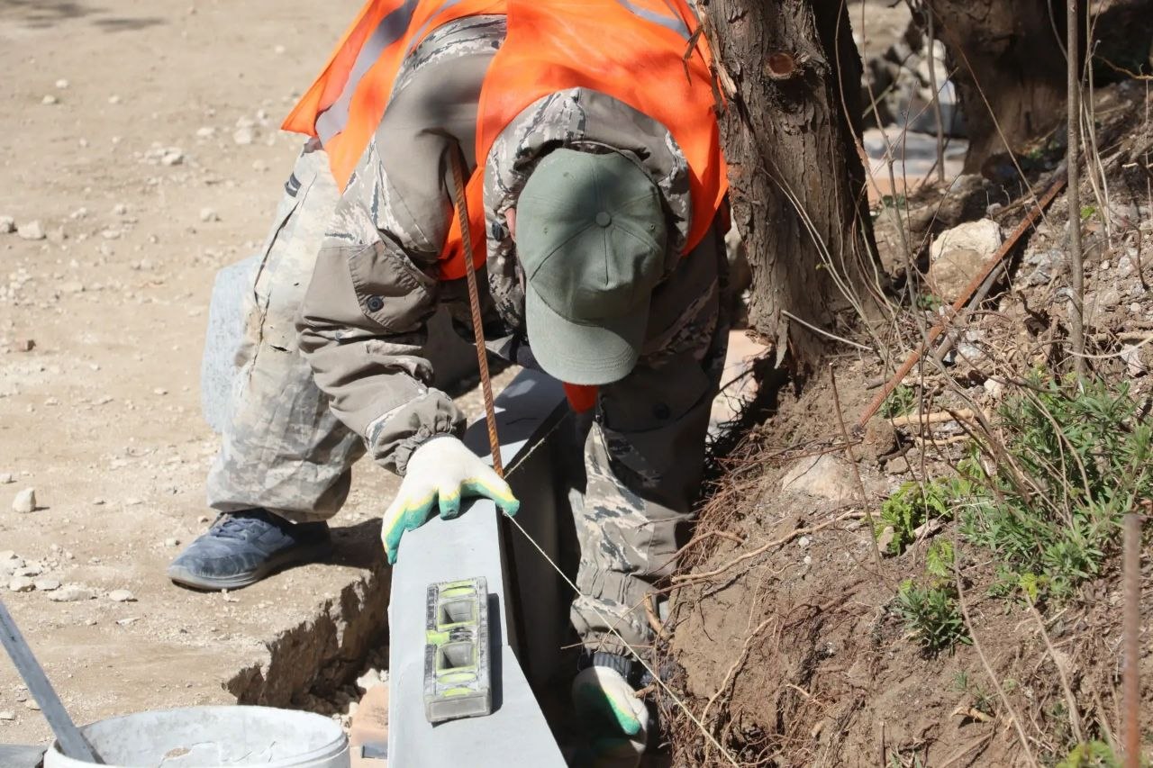 Параллельно на верхней аллее и вдоль спуска к морю продолжается установка бордюров.