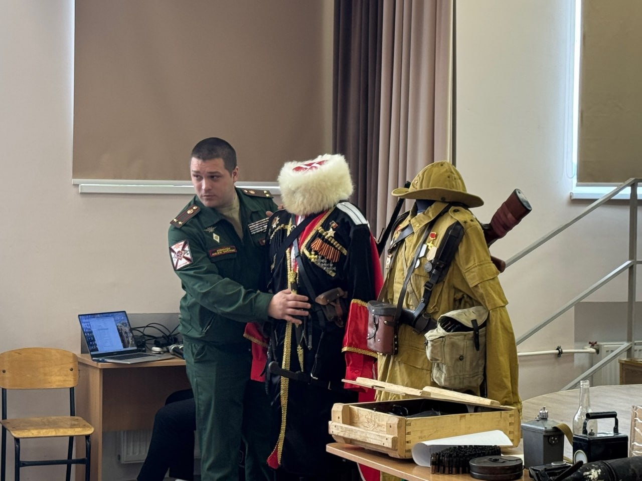 Казачья и афганская экипировка, трофейное оружие Германии, советские экспонаты и ящик с артефактами среди которых – командирские часы, крупнокалиберная пуля, гильзы, осколки снаряда – прямо с поля боя. Всё это передали в музей «Родина», который находится в Мазанской школе. С 2024 года образовательное учреждение активно сотрудничает с военно-патриотическими клубами, которые помогают пополнять коллекцию.