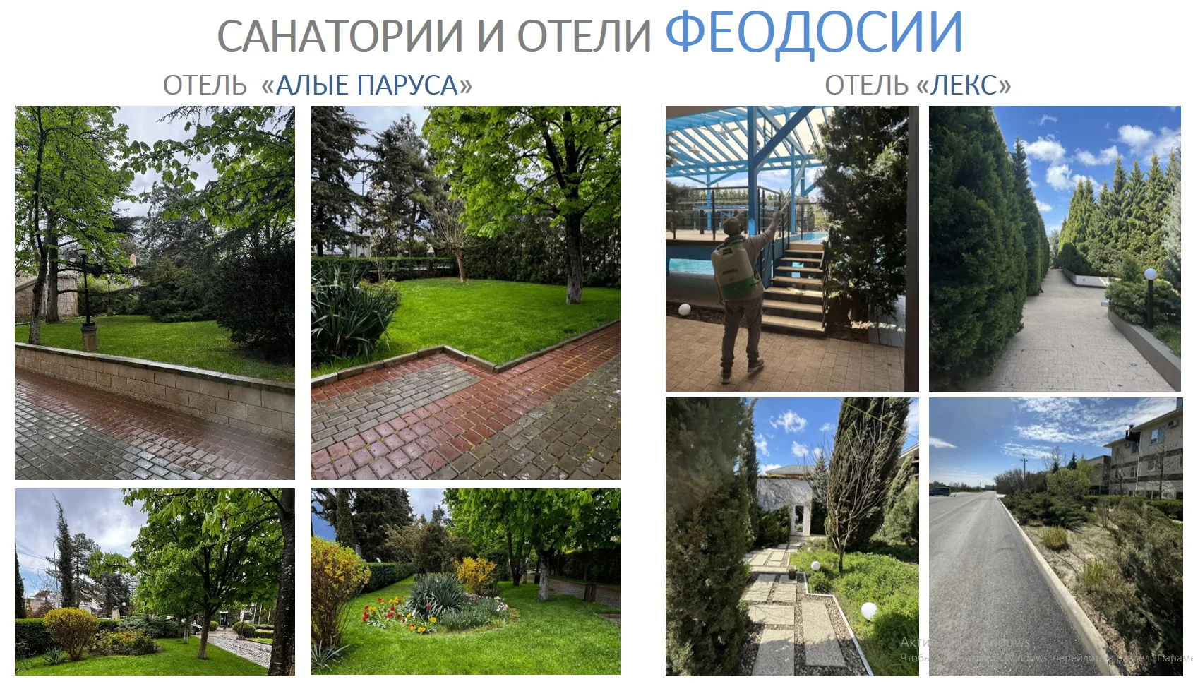 Работы достаточно: нужно сделать фигурную стрижку кустарикам, убрать пляжи, покосить траву, высадить цветы, обрезать сухие ветви деревьев, покрасить и побелить конструкции. Все делается, чтобы наши объекты сияли чистотой и вниманием к гостям.