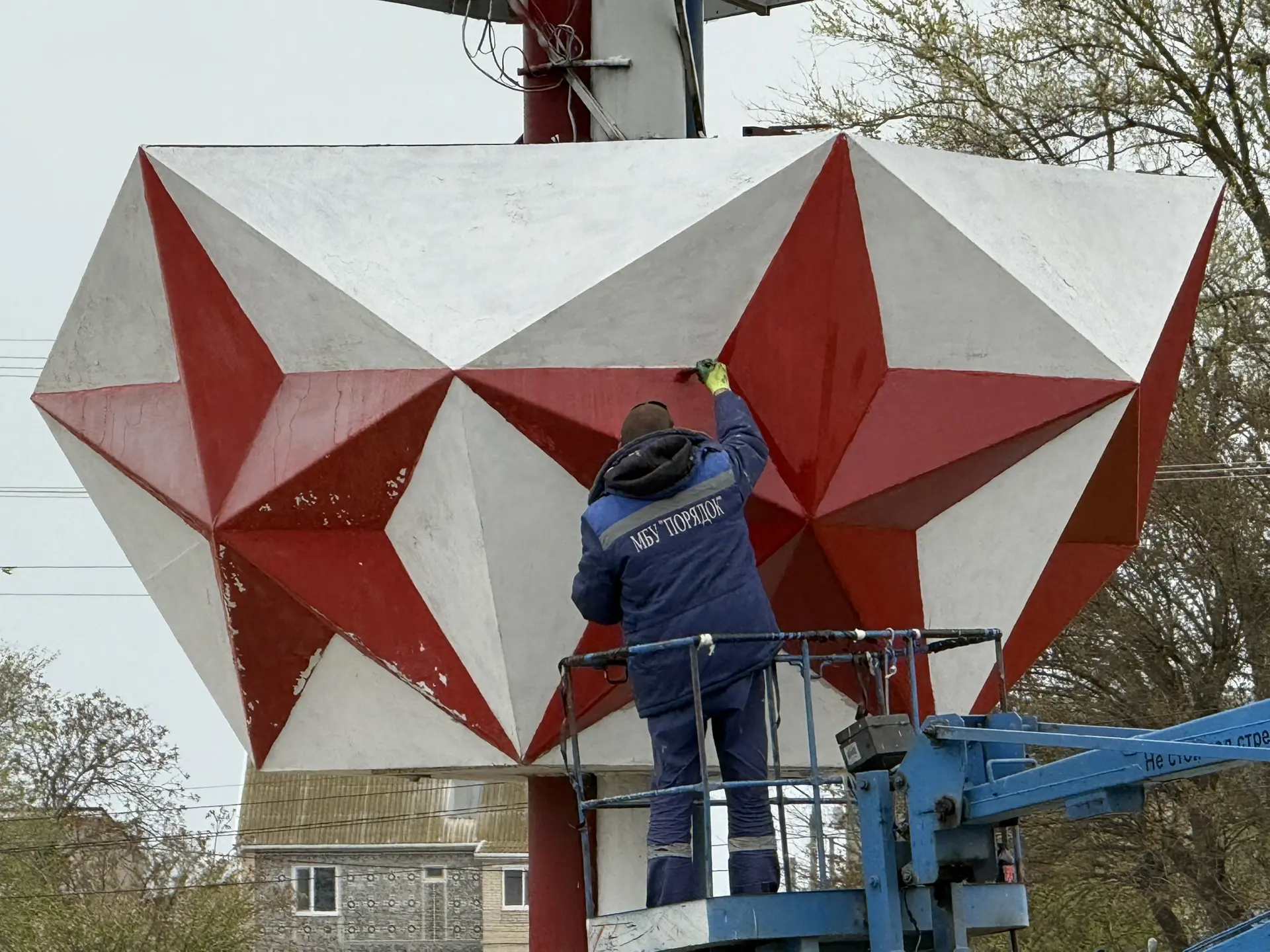 Специалисты МБУ «Порядок» обновляют лакокрасочное покрытие стелы на кольце по улице Эскадронной, а также окрашивают бордюры на въездной группе в город.