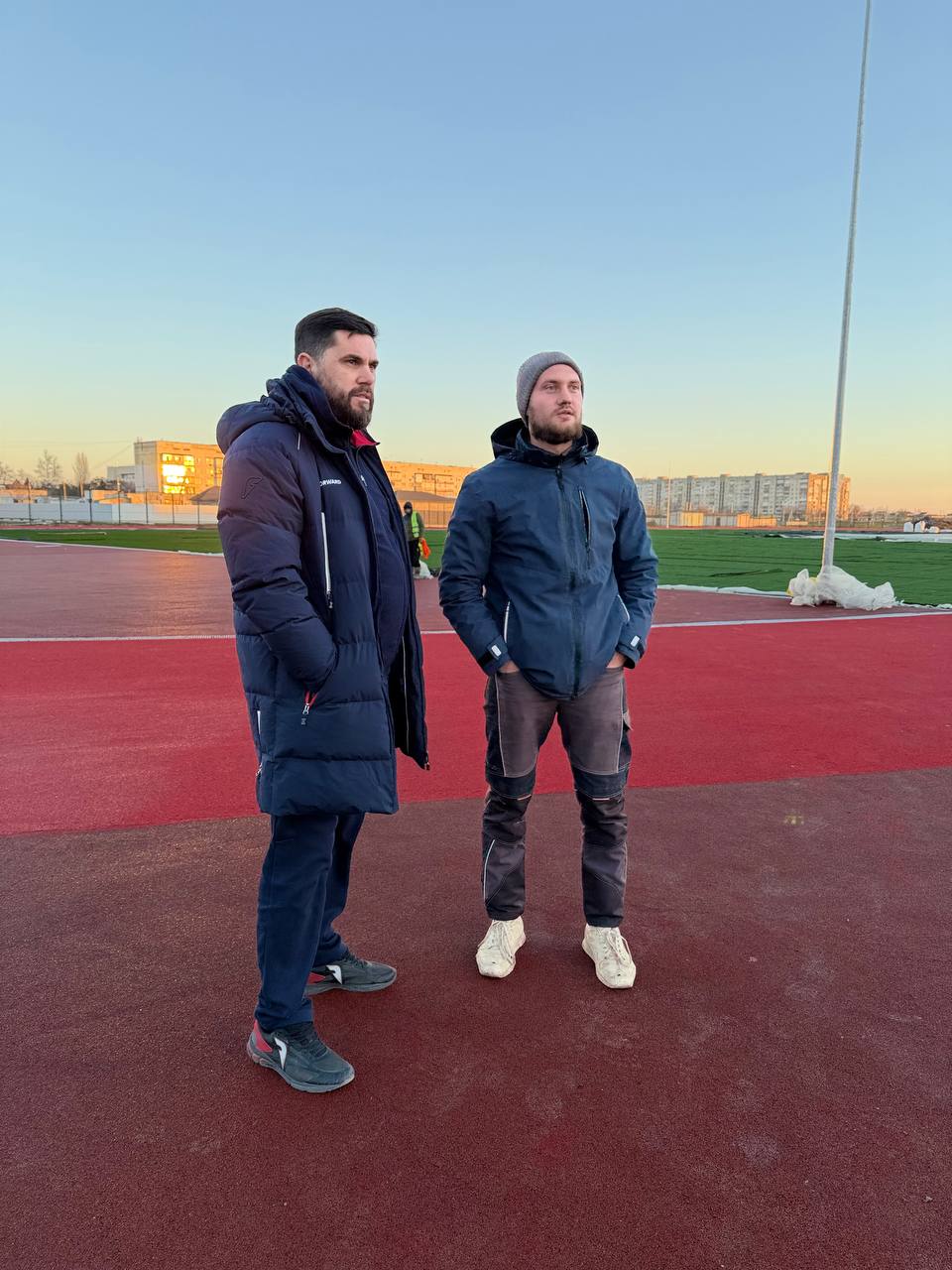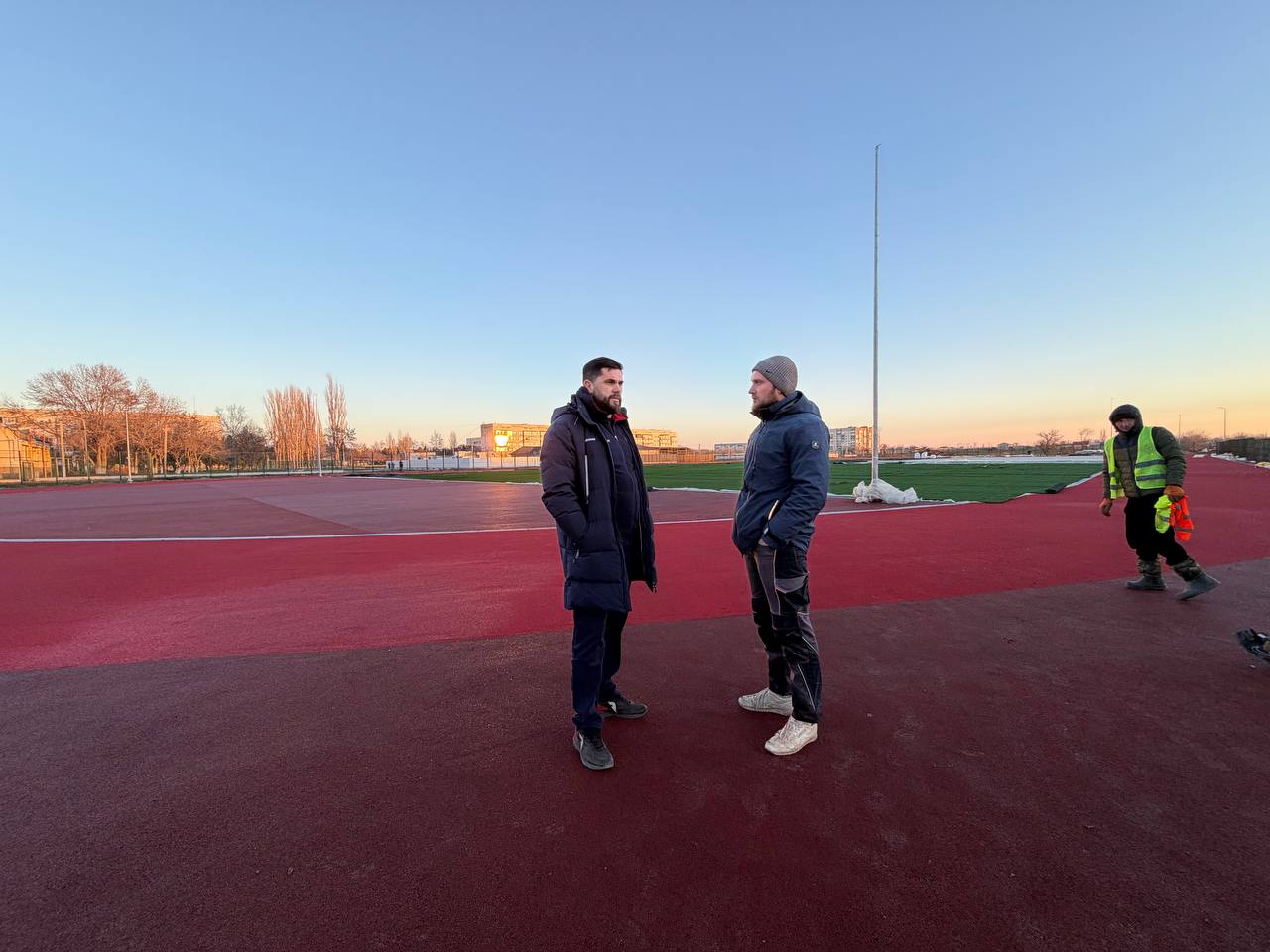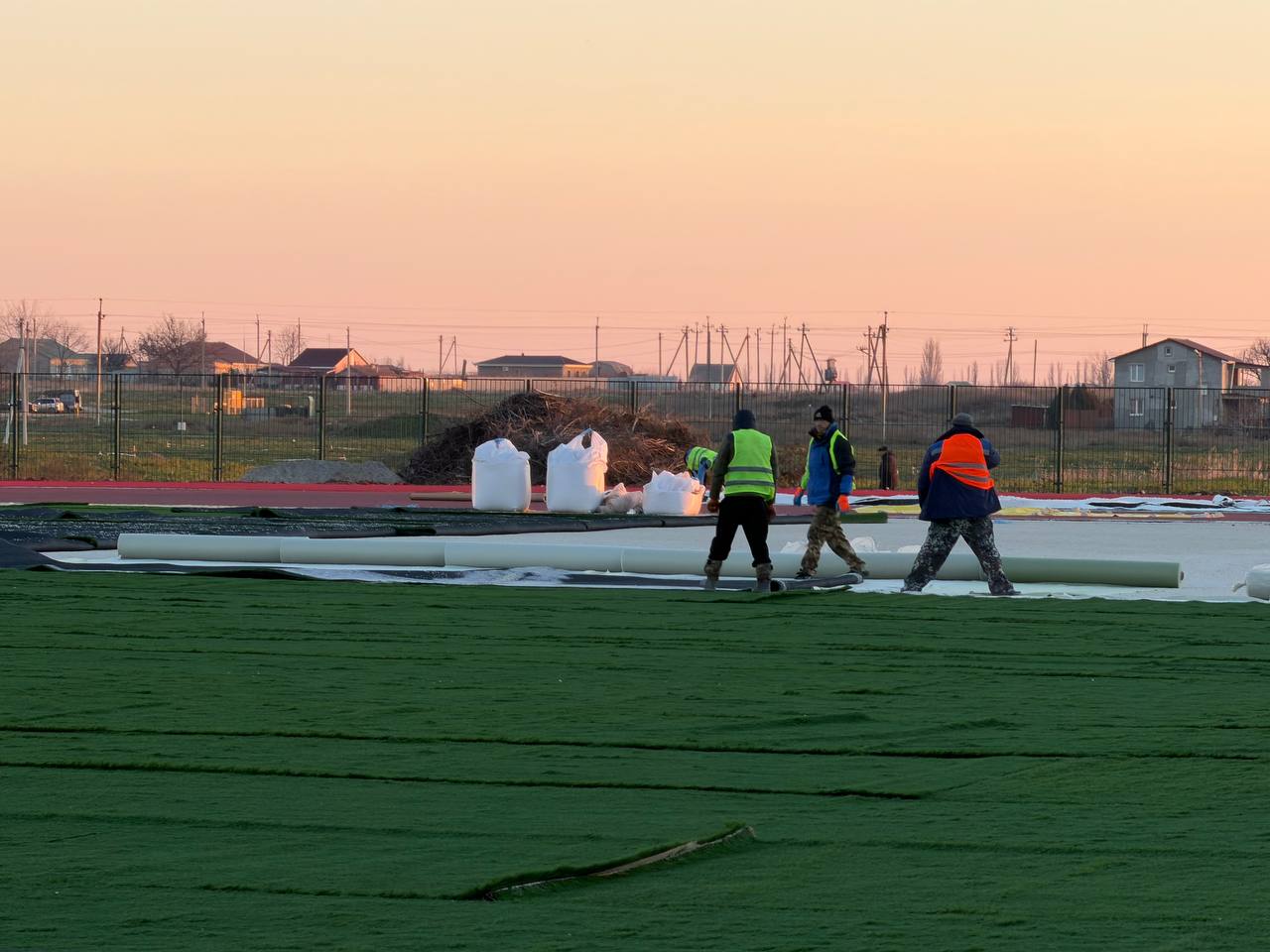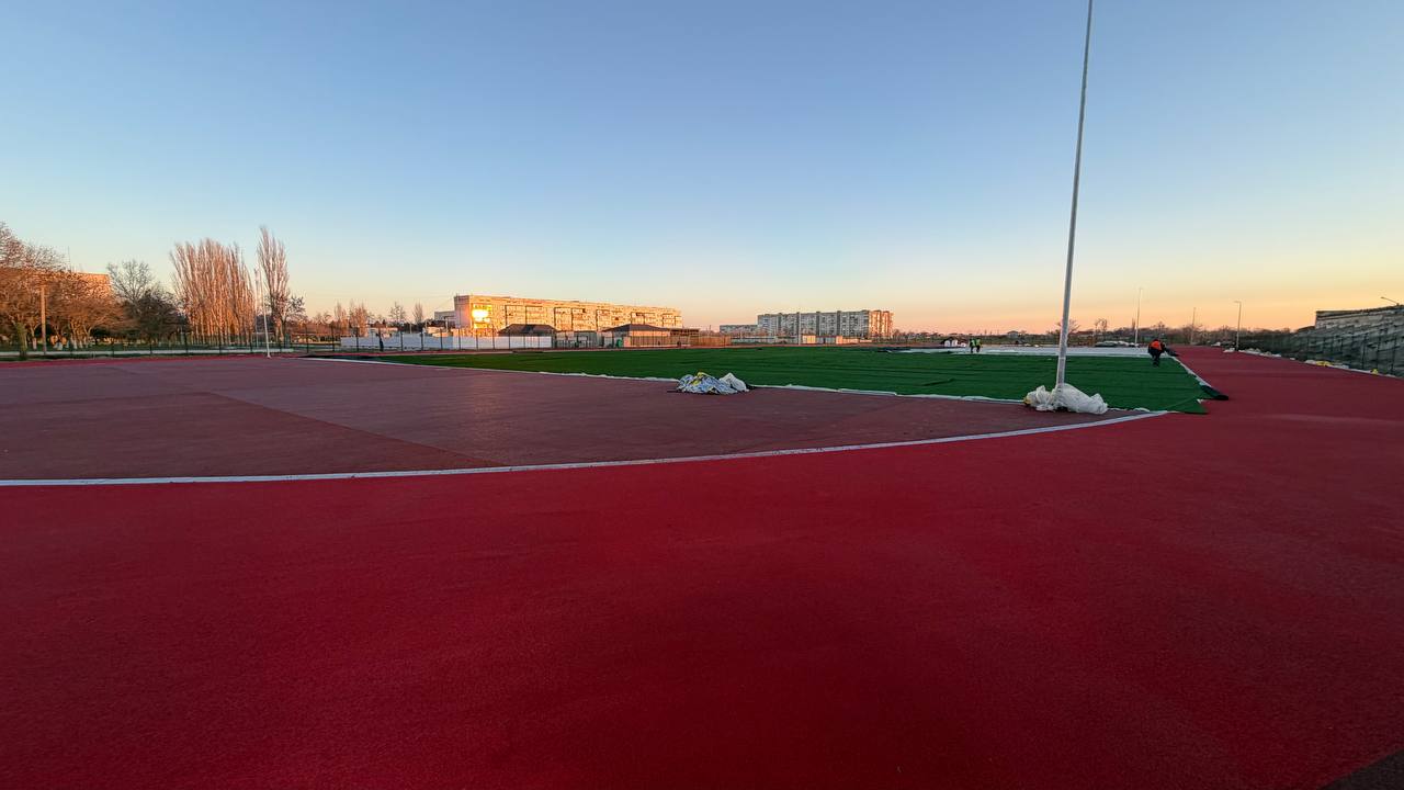 Установлено по периметру ограждение, опоры для наружного освещения, уложено резиновое покрытие, на котором будут размечены беговые дорожки.